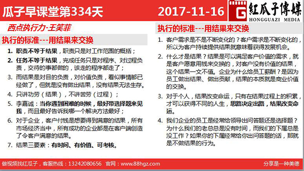 2、什么才是結(jié)果?結(jié)果是可以滿足客戶價值的需求,就是客戶愿意用錢來交換的,對客戶沒有價值的結(jié)果,這個結(jié)果一文不值。企業(yè)為什么給員工薪酬?是因?yàn)閱T工做出結(jié)果、做出貢獻(xiàn),結(jié)果的本質(zhì)就是商業(yè)價值的交換。