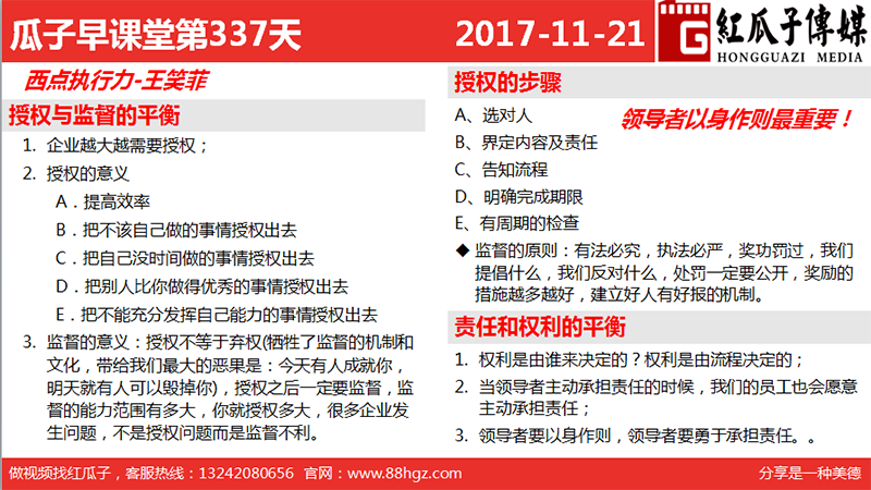 3、監(jiān)督的意義:授權(quán)不等于棄權(quán)(犧牲了監(jiān)督的機(jī)制和文化,帶給我們最大的惡果是:今天有人成就你,明天就有人可以毀掉你),授權(quán)之后一定要監(jiān)督,監(jiān)督的能力范圍有多大,你就授權(quán)多大,很多企業(yè)發(fā)生問(wèn)題,不是授權(quán)問(wèn)題而是監(jiān)督不利。
