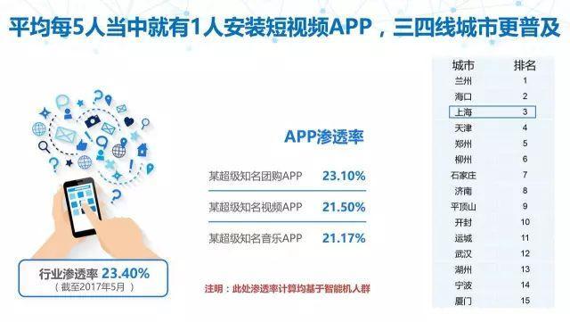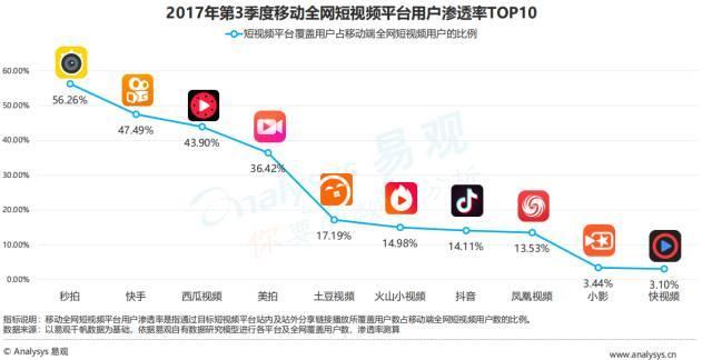 2017年第3季度移動(dòng)全網(wǎng)短視頻平臺(tái)根據(jù)用戶滲透率分為三個(gè)梯隊(duì):