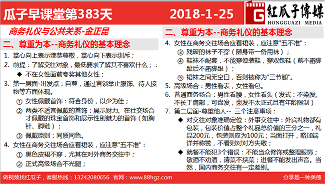 紅瓜子傳媒首頁>相關資訊>最新動態(tài)>紅瓜子早課堂第383期:商務禮儀的基本理念-尊重為本