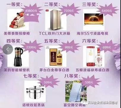 49800元按摩儀、7999元TCL雙開門冰箱、海爾55寸電視機(jī)、美的破壁機(jī)....最低抽中598元富安娜空調(diào)被.....100%中獎(jiǎng),絕無空獎(jiǎng)