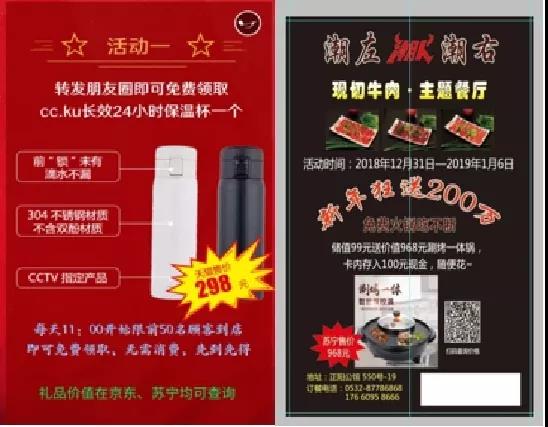 引流產品是,你轉發(fā)朋友圈即可免費領取價值298元的保溫杯一個(限名額、時間)。開門產品是,凡是進店顧客成為會員即可免費領取價值968元的韓國麥石飯涮烤一體鍋一套。