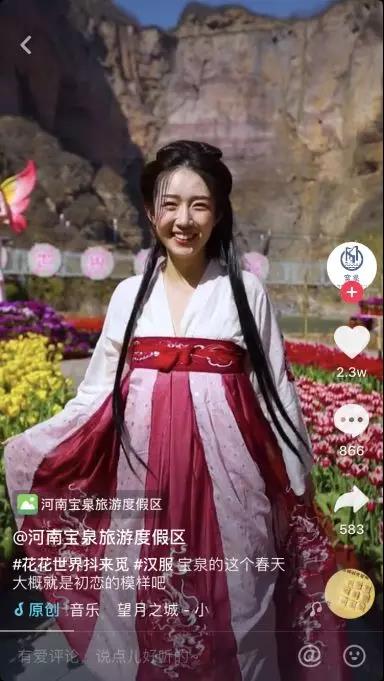 抖音區(qū)域互動賽正成為品牌商家的標(biāo)配手段。在此次河南寶泉開啟的“花花世界抖來覓”抖音區(qū)域互動賽中,更加重視不同風(fēng)格內(nèi)容的創(chuàng)意。例如,除了除常規(guī)的風(fēng)景展示、花田景觀等視頻,更邀請古典漢服達(dá)人、素人探索與景區(qū)結(jié)合的內(nèi)容視頻。