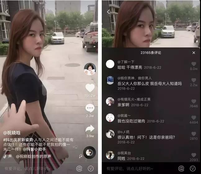 一開始我們也像大多數(shù)人剛做抖音的時(shí)候一樣,模仿抖音熱門,對(duì)個(gè)口型,跳個(gè)舞蹈,像祝曉晗的第一條視頻內(nèi)容,就是祝曉晗在我們樓下的商場(chǎng)里,跳的一個(gè)舞蹈。