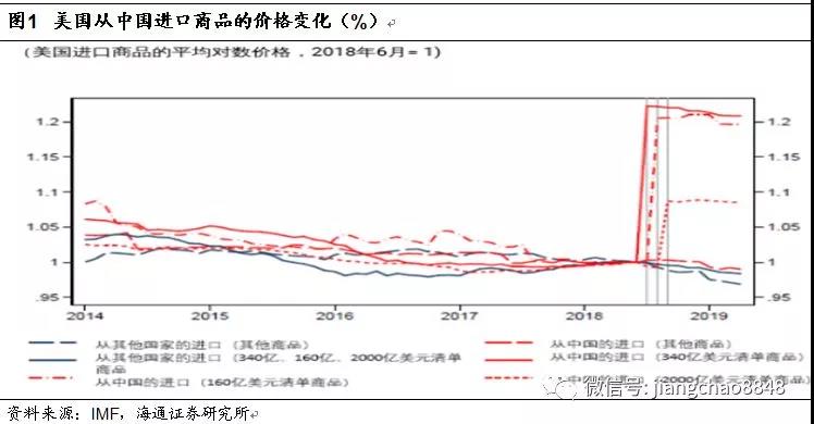 隨后IMF在5月份發(fā)布了一份重要的報告《TheImpact of US-China Trade Tensions》,研究了加征關(guān)稅后中國對美出口產(chǎn)品到岸價的變化,發(fā)現(xiàn)最早500億美元商品關(guān)稅上調(diào)25%之后,美國到岸價漲幅在20%左右;而2000億美元商品關(guān)稅稅率上調(diào)10%之后,美國到岸價漲幅在8-9%。也就是說,對中國產(chǎn)品征收的關(guān)稅絕大部分體現(xiàn)為到岸價的提升。