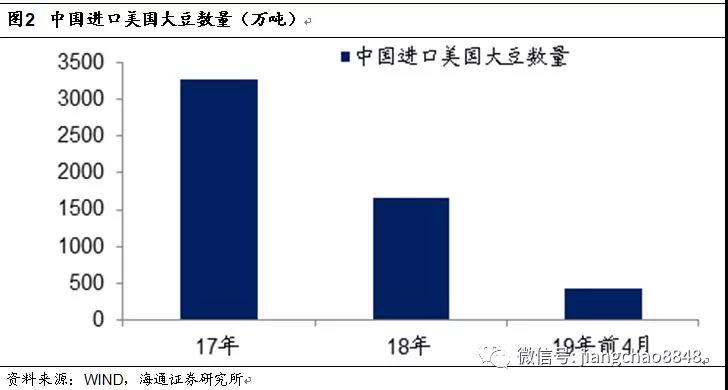我國是美國最大的農(nóng)產(chǎn)品出口市場,尤其是大豆。根據(jù)中國海關(guān)的數(shù)據(jù),我國17年進口了3285萬噸的美國大豆,然而在18年中美貿(mào)易摩擦爆發(fā)之后,18年我國進口美國大豆數(shù)量下降了一半至1664萬噸。而在19年的前4個月,我國進口美國大豆數(shù)量同比又萎縮了70%。