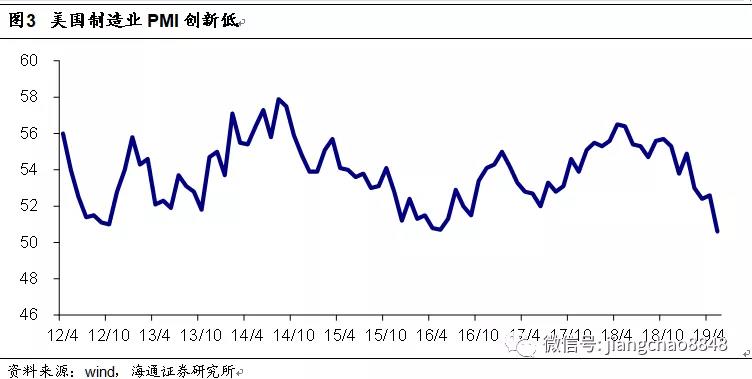 而最大的變化還是在于經(jīng)濟的下滑。在5月初特朗普重啟貿(mào)易摩擦之前,美國公布的1季度GDP增速高達3.1%,而且就業(yè)數(shù)據(jù)也欣欣向榮。但到了6月份,美國Markit制造業(yè)PMI指數(shù)創(chuàng)下10年新低,新增就業(yè)大幅下滑,國債利率曲線倒掛,意味著經(jīng)濟衰退的風(fēng)險大幅上升。