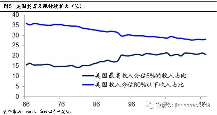 根據(jù)美國商務(wù)部普查局的數(shù)據(jù),美國住戶中收入低于60%分位的家庭,其收入占比已經(jīng)從1966年的36%降至目前的28%。而在考慮了通脹的變化以后,美國收入低于40%分位的家庭,其實際收入在過去40年幾乎沒有變化。