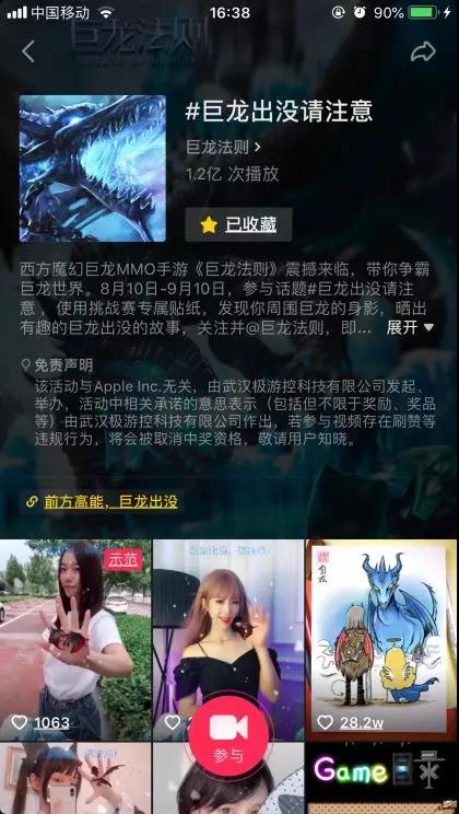 挑戰(zhàn)賽是抖音為各類品牌獨家定制的高品質(zhì)話題活動。我們注意到,8月10日上線的《巨龍法則》手游挑戰(zhàn)賽,3天內(nèi)視頻播放次數(shù)就過億。同時,抖音用戶還貢獻出將近400個原創(chuàng)視頻。并且,這個數(shù)據(jù)還在不斷的攀升,一個刷屏級的營銷案例或許正在產(chǎn)生。