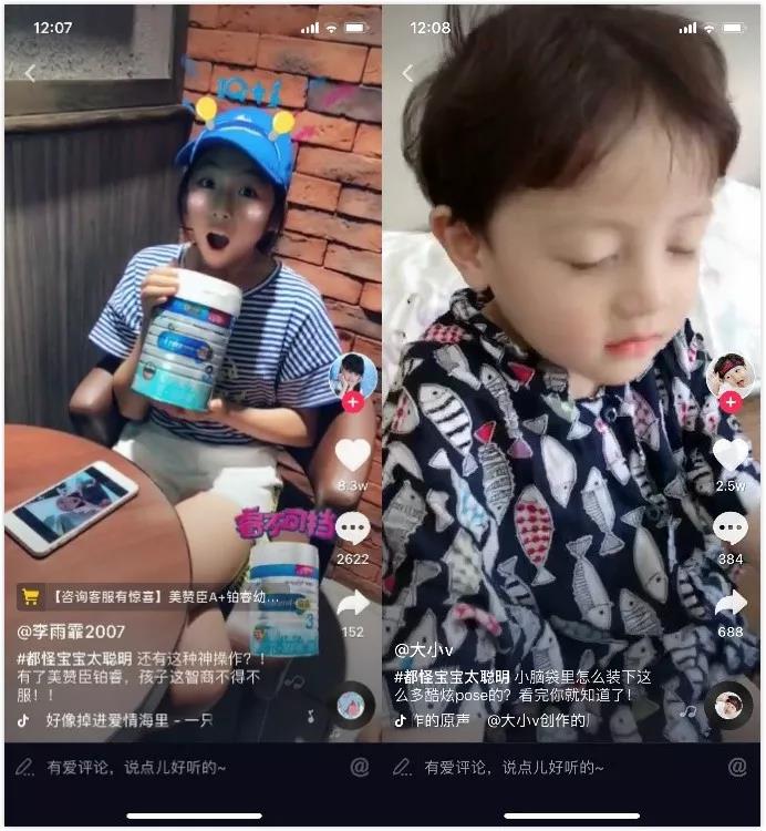 李雨霏2007和大小V的挑戰(zhàn)賽視頻都受到了廣大用戶的歡迎,分別收獲了8.3萬和2.5萬的點贊。李雨霏2007的視頻主打劇情的前后反轉,大小V則是充分運用了自己的激萌之力,粉嫩的小臉蛋和忽閃的大眼睛,讓用戶對美贊臣鉑睿的萌寶印象過目不忘。