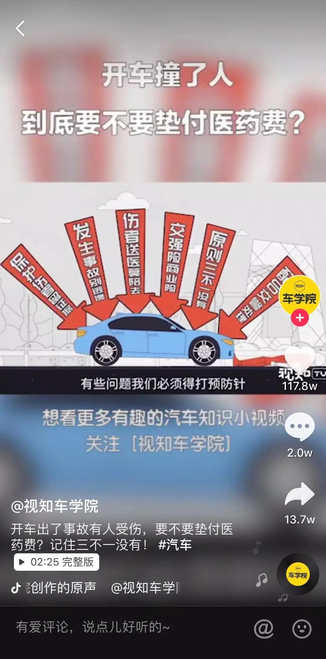 「視知車學(xué)院」曾一周漲粉62.3萬,分享的知識(shí)相對(duì)更加冷門,例如,一輛車的加速能力好不好,該看功率還是扭矩?開車撞了人,要不要墊付醫(yī)藥費(fèi)?
