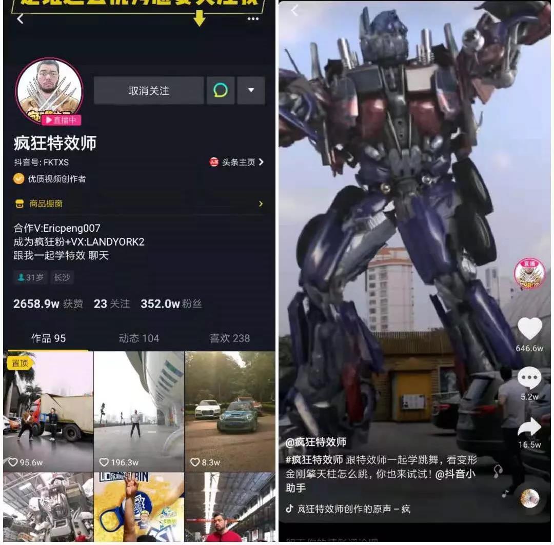 抖音上另一個以制作為中心的賬號,是長沙廣電國有控股公司旗下的@瘋狂特效師。去年5月,因為一條“擎天柱跳舞”的視頻,@瘋狂特效師 幾天功夫播放近1個億,漲粉70萬。運營一年半,現(xiàn)在粉絲已有340多萬。 Land Yok的視頻全是大場面大制作。你可以看到類似《變形金剛》的鏡頭,一輛停在路邊的汽車,突然車門張開、輪胎旋轉(zhuǎn),變成巨型機器人跑了起來。你還可以看到技術(shù)宅男的硬核表白:女孩面前的高樓突然插滿五彩氣球,男孩一個響指,氣球伴隨高樓全部飛走……