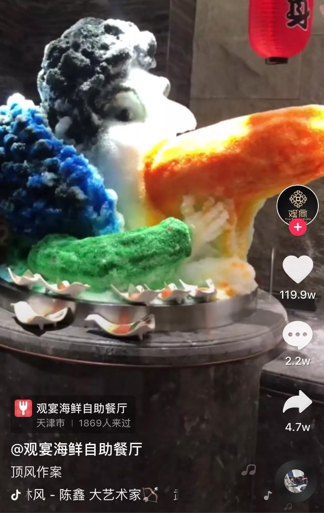 每過一段時(shí)間抖音就會(huì)流出一批“神曲”、流行場(chǎng)景的爆火視頻,我們制定了蹭熱點(diǎn)方案,用抖音上的熱門音頻、熱門拍攝手法、近期熱點(diǎn)進(jìn)行拍攝,為“觀宴”策劃用冰雕制作熱點(diǎn)形象的視頻。